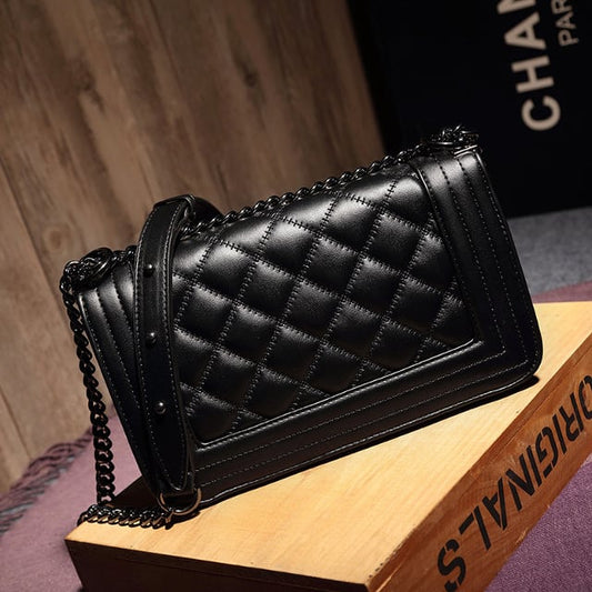 ラムスキンチェーンショルダーバッグ 羊革 黒 ボーイタイプバッグ レディース