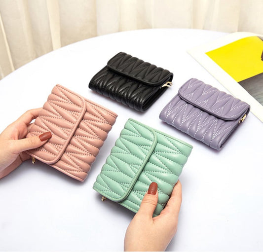 ラムスキン二つ折り財布 マトラッセ 2way チェーンウォレット ピンク グリーン レディース