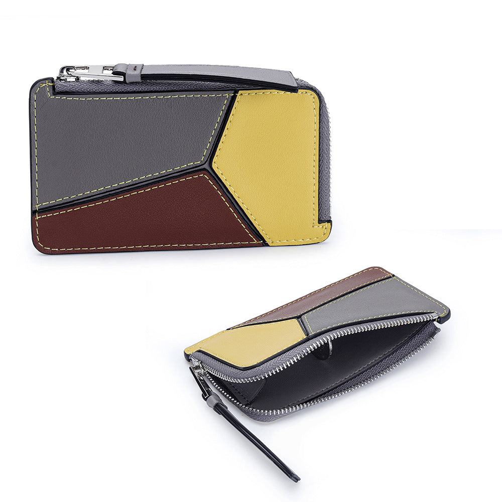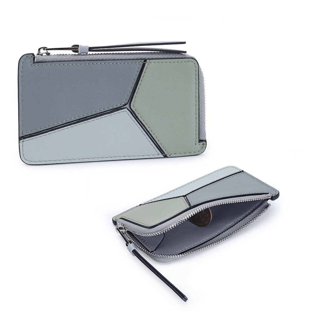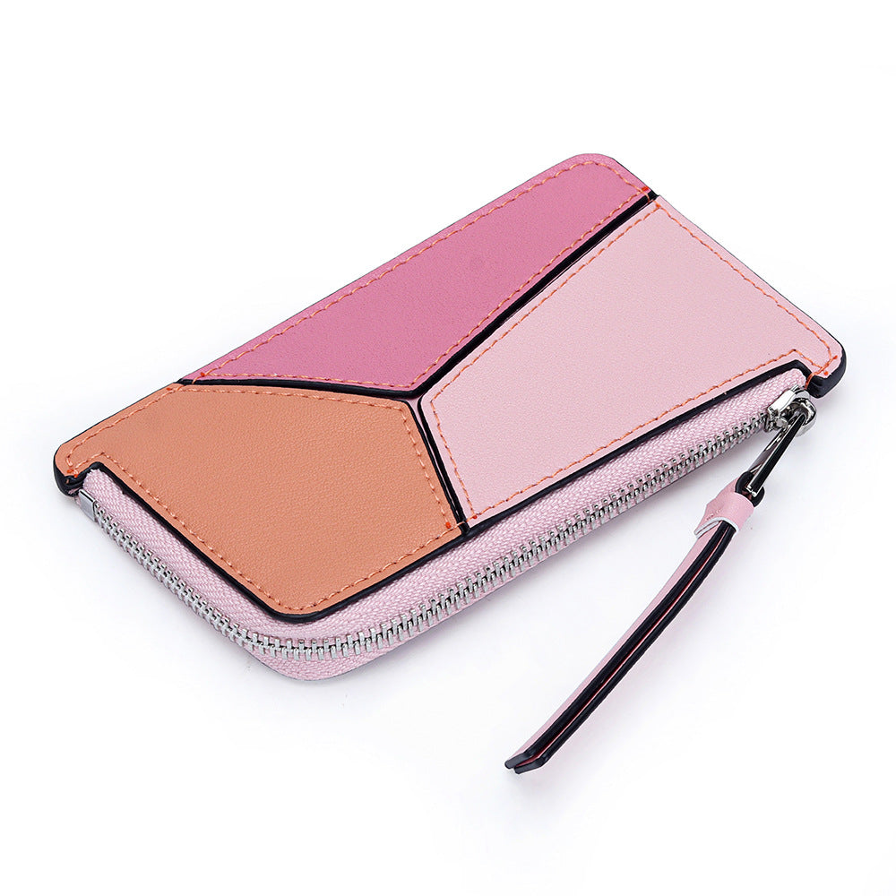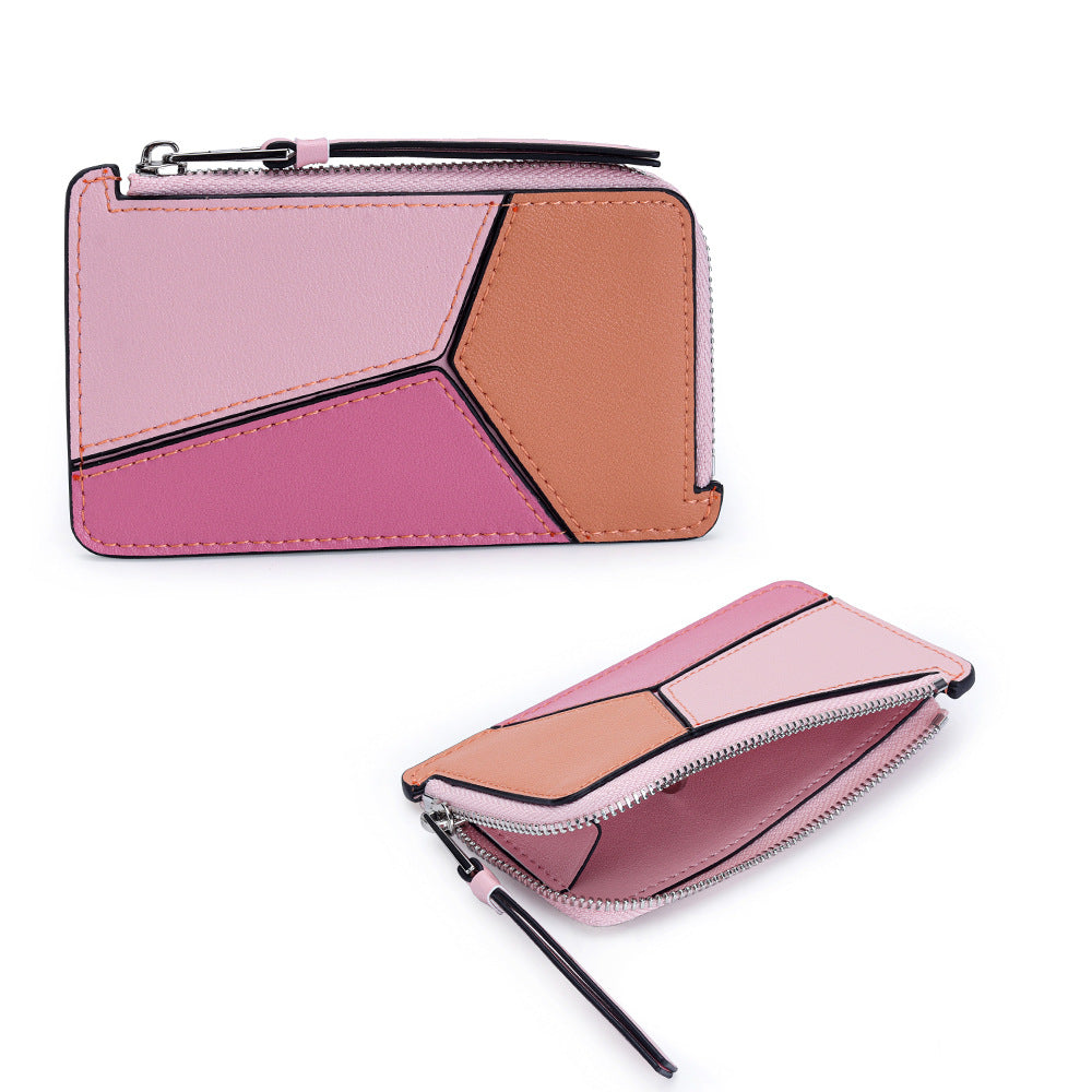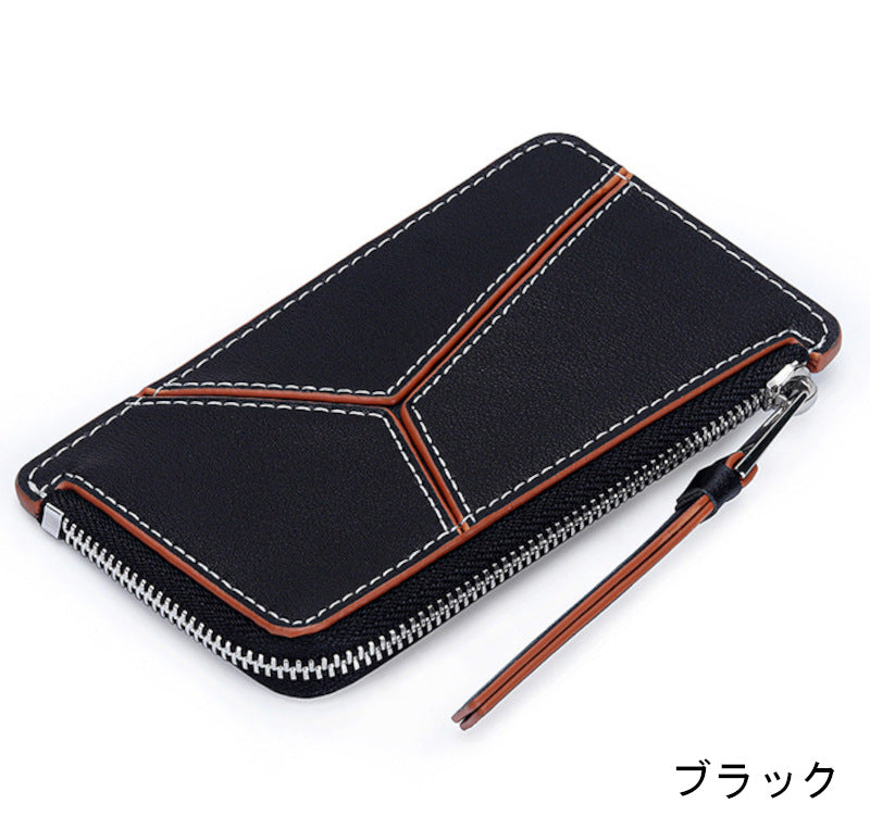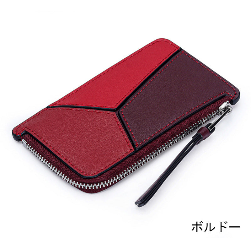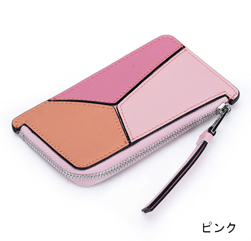 薄型財布 ラウンドファスナー レディース 本革二つ折り財布 本革コインケース パズル風 黒 ピンク